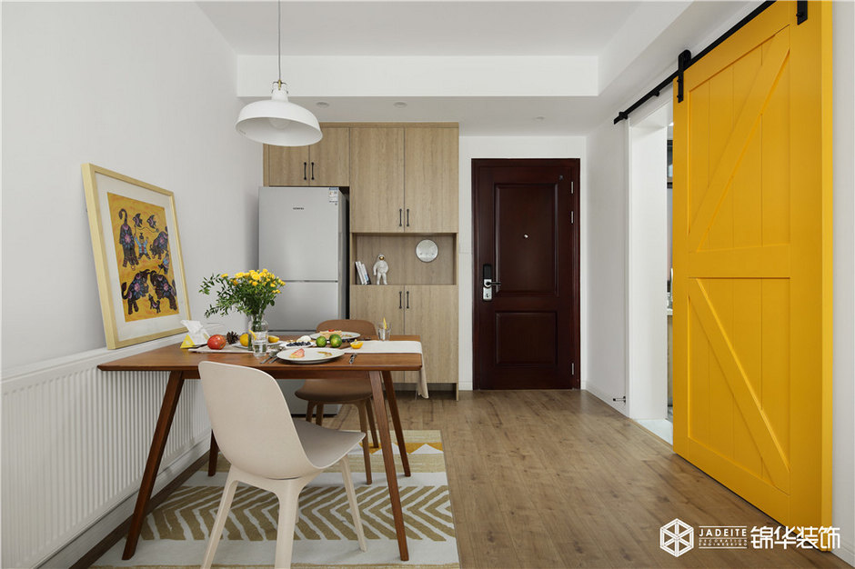 ▲明黃色谷倉門,是空間的視覺亮點(diǎn)之一,它作為廚房和客餐廳的分界線,既有效地節(jié)省了空間占比,又十分具有趣味性!