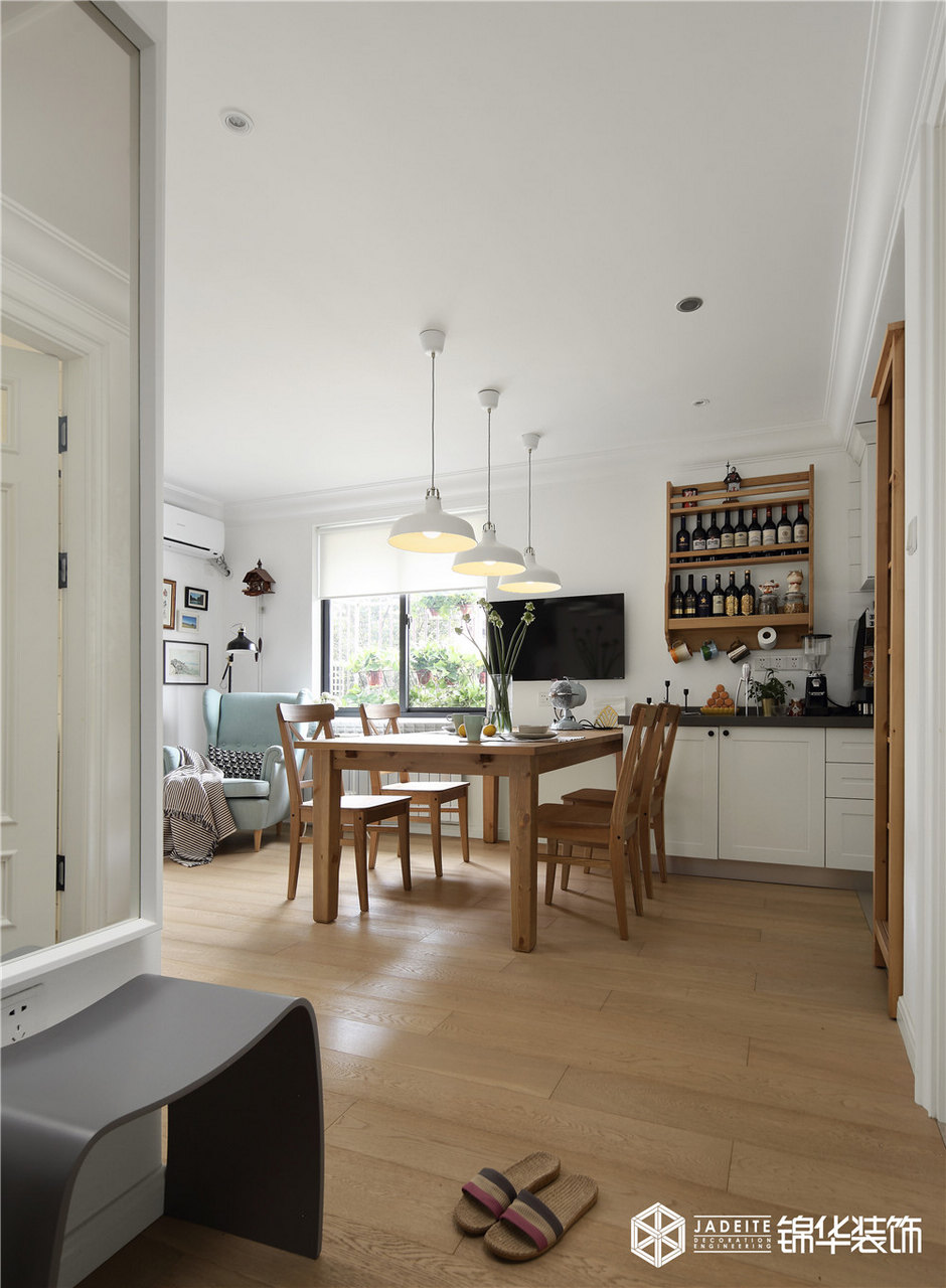 客廳以清新的白色護(hù)墻板搭配溫馨的米色墻紙,豐富了整個(gè)空間層次。電視背景墻處做了一扇隱形門,使得整個(gè)空間更加具有完整性和對(duì)稱性。